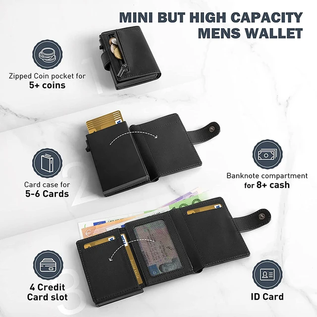 This Black wallet is designed in Trifold and it has a metal card case which has quick-access pop up mechanism. Through sliding the button at the right side of the compact wallets, all cards will be pop up automatically and orderly. Convenient for the daily use!